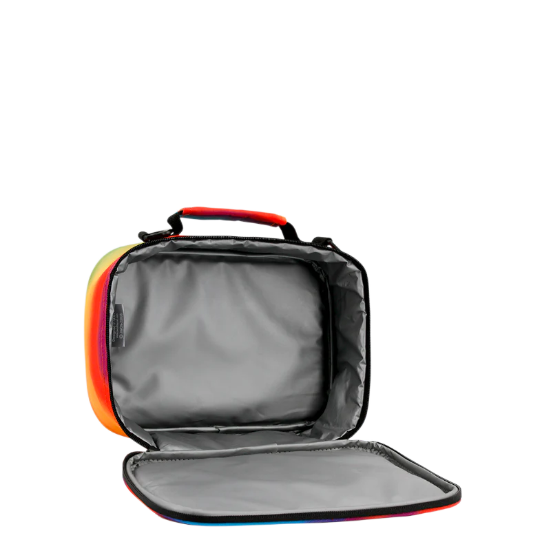 The J World Cody Lunch Bag is a colorful, durable lunch bag perfect for kids. It features a classic rectangular shape with a vibrant allover print, a padded top handle, and an adjustable shoulder strap for easy carrying. The insulated main compartment keeps lunches fresh, and the exterior pocket adds extra storage.